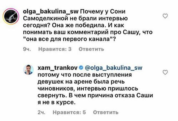 «Потому что после выступления девушек на арене была речь чиновников, интервью пришлось свернуть. В чем причина отказа Саши, я не в курсе», – написал Траньков.