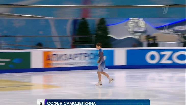 Самоделкина выступила в новом платье в короткой программе на чемпионате России: голубом с градиентом и рукавами разных цветов