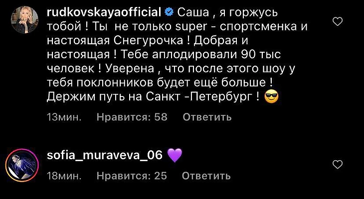 Рудковская – Трусовой: «Тебе аплодировали 90 тысяч человек! Уверена, что после шоу у тебя поклонников будет еще больше»