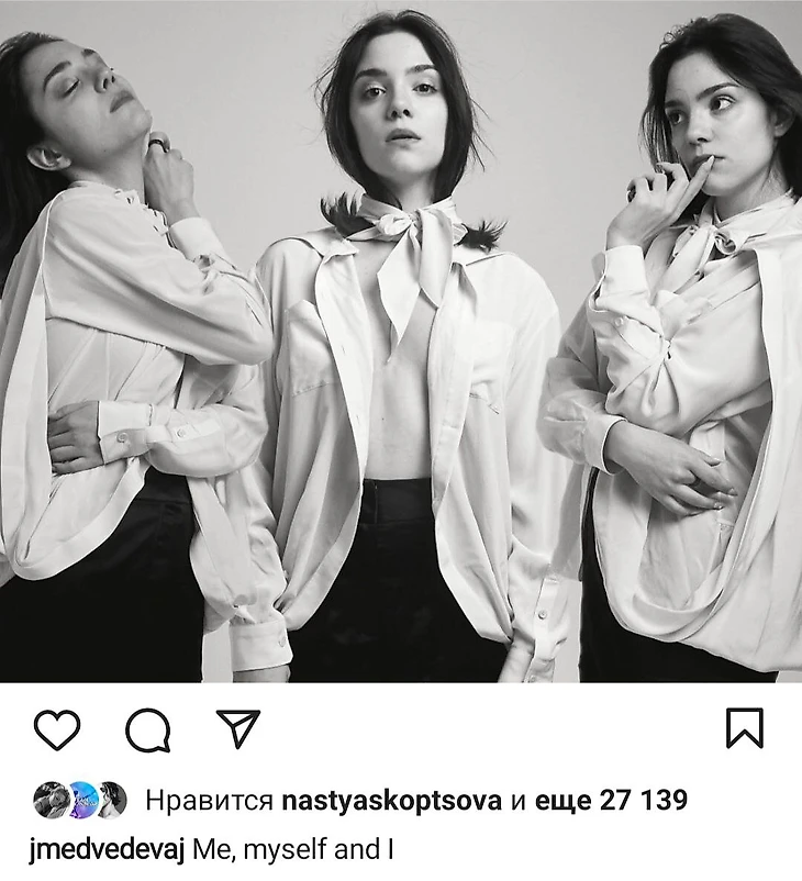 «Me, myself and I». Медведева опубликовала фото в расстегнутой рубашке на голое тело