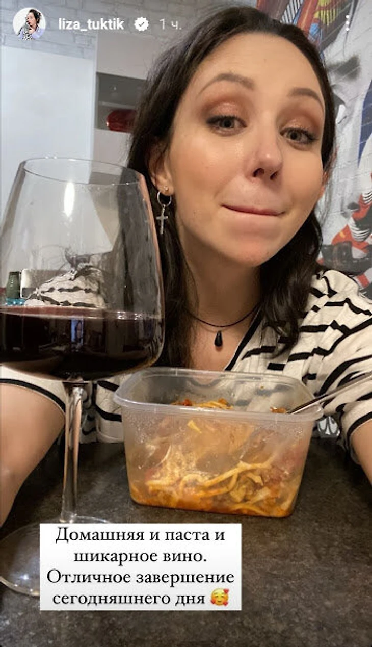 Елизавета Туктамышева: «Домашняя паста и шикарное вино. Отличное завершение сегодняшнего дня»