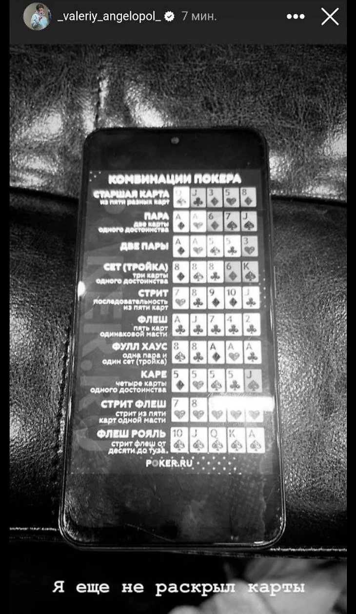 «Я еще не раскрыл карты», – написал Ангелопол в соцсетях, приложив картинку с комбинациями в покере.