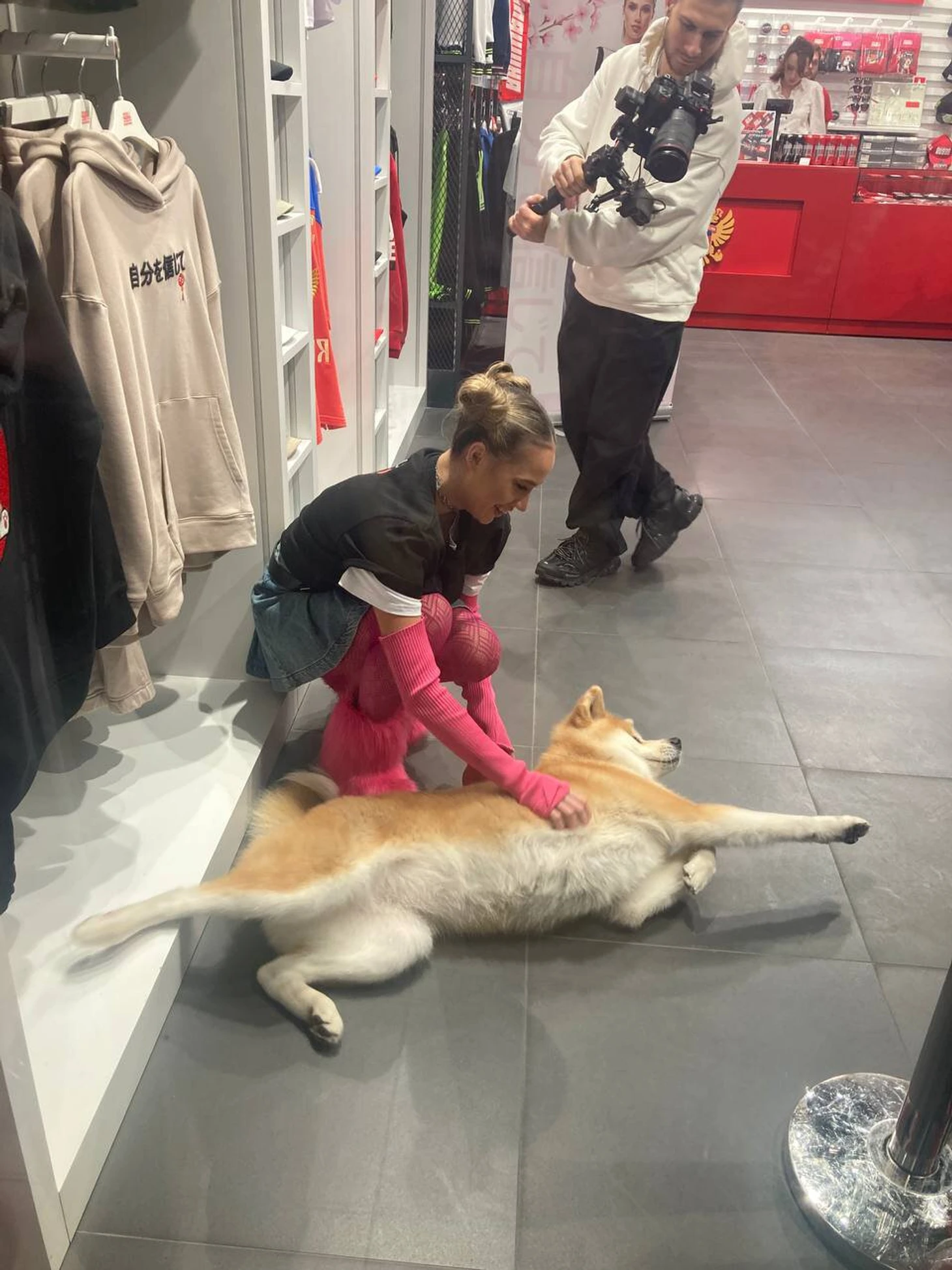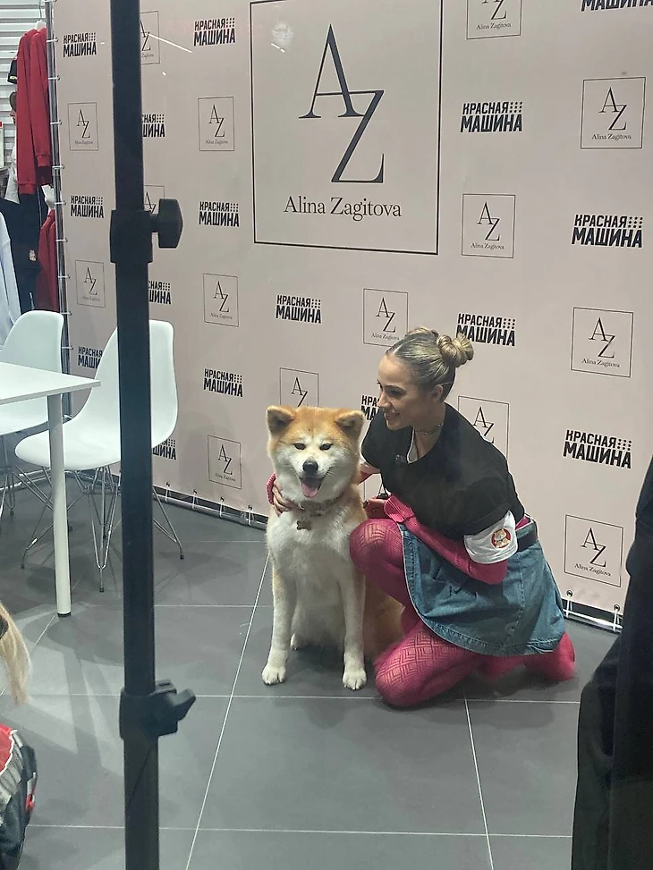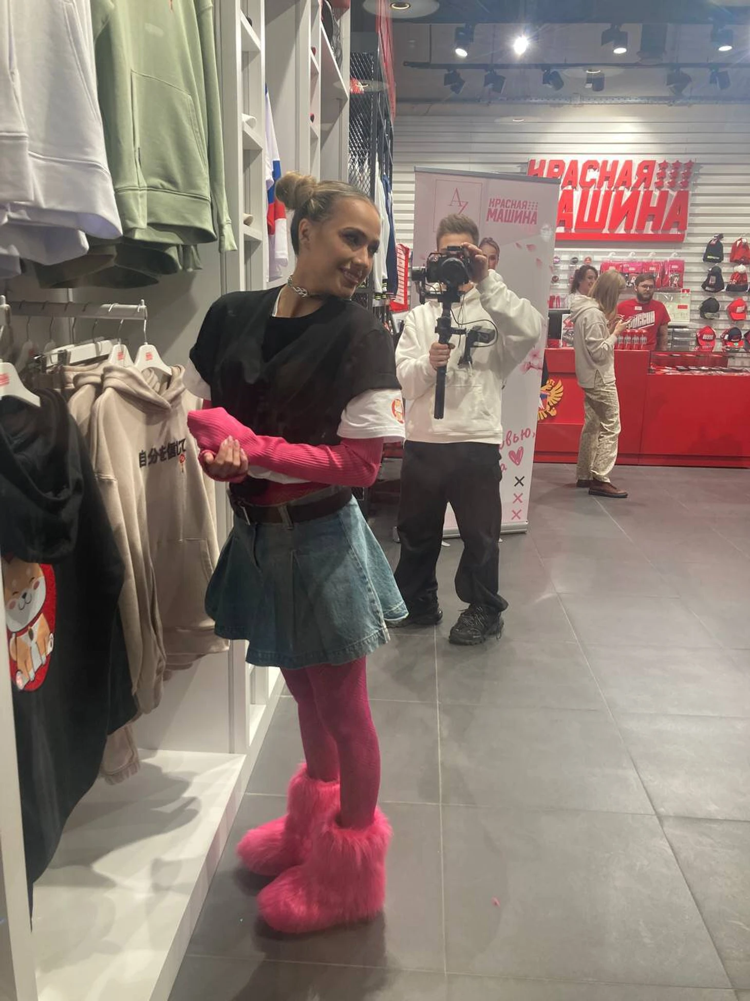 Загитова пришла с собакой Масару. Для презентации фигуристка выбрала джинсовую мини-юбку, футболку из собственной коллекции, а также розовые рукава, колготки и розовые меховые сапожки.