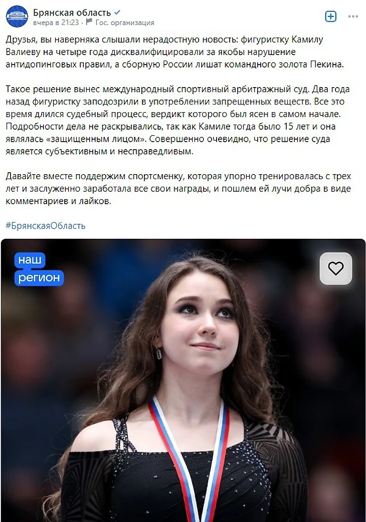 Сегодня в официальных соцсетях правительств разных регионов России стали появляться посты с поддержкой Камилы. Во всех сообщениях одно и то же фото и практически идентичный текст.