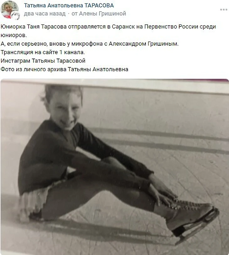 «Юниорка Таня Тарасова отправляется в Саранск для участия в первенстве России среди юниоров. Вновь с Александром Гришиным у микрофона», – написала Тарасова.