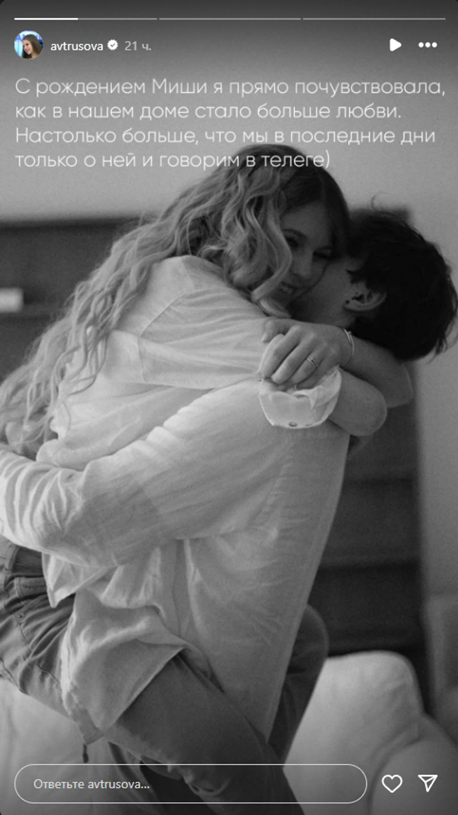 «С рождением Миши я прямо почувствовала, как в нашем доме стало больше любви. Настолько больше, что мы в последние дни только о ней и говорим в телеге», – написала 21-летняя Трусова в сторис инстаграма.