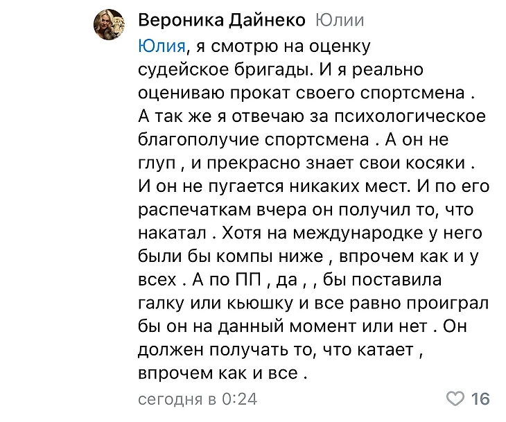Я смотрю на оценку судейской бригады. И я реально оцениваю прокат своего спортсмена. А также я отвечаю за психологическое благополучие спортсмена. А он не глуп и прекрасно знает свои косяки. И он не пугается никаких мест. И по его распечаткам вчера он получил то, что накатал. Хотя на международке у него были бы компы ниже, впрочем, как и у всех. А по ПП, да, я бы поставила галку или кьюшку, и все равно, проиграл бы он на данный момент или нет. Он должен получать то, что катает, впрочем, как и все», – ответила Дайнеко.