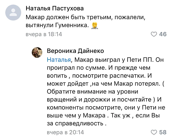 «Макар выиграл у Пети ПП. Он проиграл по сумме. И прежде чем вопить, посмотрите распечатки. И, может, дойдет, на чем Макар потерял (обратите внимание на уровни вращений и дорожки и посчитайте). И компоненты посмотрите, они у Пети не выше, чем у Макара. Так уж, если Вы за справедливость. <...>