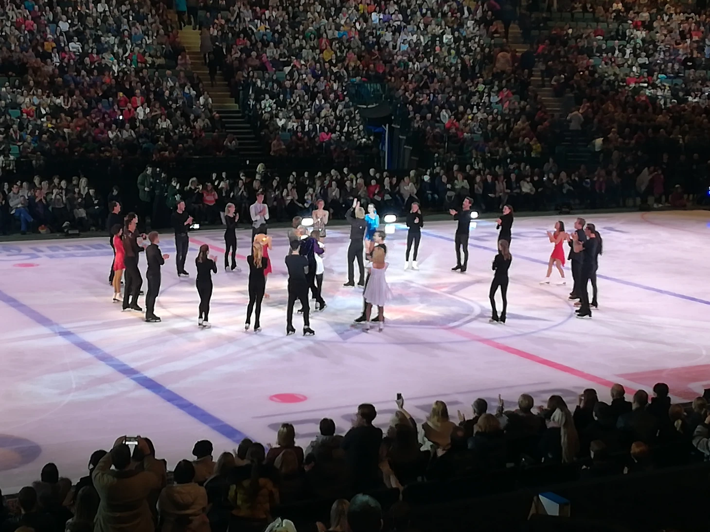 Финальный номер был поставлен очень необычно - отдельных выходов не было, все кружили и как бы между прочим периодически показывали что-нибудь из своих умений - так, Серафима Саханович снова прыгнула свой шикарный лутц с риппоном. А затем все более-менее остановились, и две Королевы - Аделина и Ирина - в центре катка показали свои шикарные вращения: Ирина исполнила заклон с таким бильманом, какой мало кто и из действующих фигуристок сделает лучше, а Аделина - уникальное вращение собственного изобретения в либеле. Евгений поставил точку бедуинским и своими шагами. Это было великолепно.