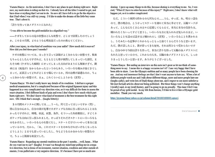 «Все зависит от моей правой лодыжки. Серьезно, я принимаю большое количество обезболивающих таблеток. Было бы лучше, если бы я мог получать уколы, но мои травмы в тех частях, которые не подходят для инъекций. Так что я принимаю много обезболивающих. Говоря честно, я не уверен в каком сейчас состоянии моя правая лодыжка. Сказав это, я могу прямо сказать, что я не в том состоянии, которое позволяет мне прыгнуть или приземлится после любого прыжка без принятия обезболивающих. Поэтому мне нужно время для лечения. Но я не уверен, как долго это будет. Само собой, я должен принимать во внимание ледовые шоу. Так как я смог выиграть еще одну золотую медаль, есть вещи, которые я хотел бы вскоре выразить [моим фанам], и я хотел бы показать мое выступление, которое сможет вызвать у людей улыбку. Так что, я рассматриваю различные вещи в позитивном ключе. Но что до соревнований, я чувствую, что мне необходим некоторый период времени для хорошего лечения. В плане мотивации, у меня совершенно нет чувства, что я хотел бы бросить фигурное катание. Единственный оставшийся источник моей мотивации на данном этапе – это четверной Аксель (смех). Я уже взял то, что я хотел взять и сделал то, что должен был сделать. Всё, что осталось - это завершить цели – цели, не мечты – из моего детства. *