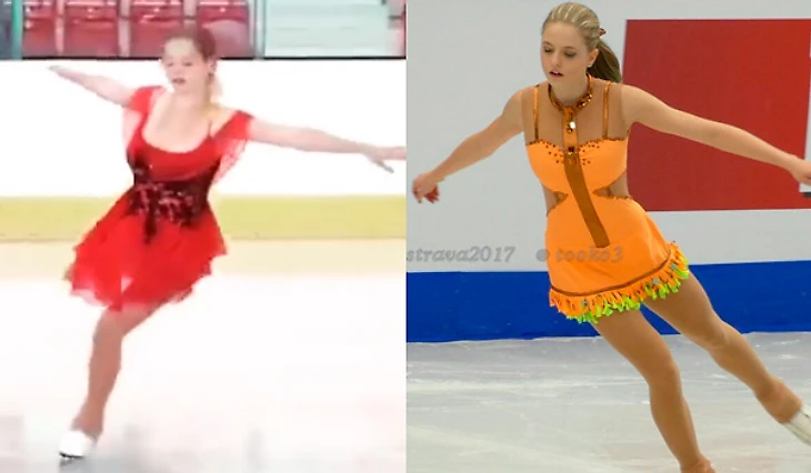 Новости с полей Ломбардии вы уже знаете. Произвольные у женщин мне удалось посмотреть полностью, много было интересных программ и прекрасных дам, однако наибольший удар по чувству прекрасного мне нанесла форма Ханзликовой (я за нее по юниорам болела). В прошлом году вырос верх, в этом году низ в калитку не пролазит. Я с трудом нашла картинку, но хочу, чтобы вы увидели, что такое «прибавить в весе по-настоящему». После этого все пубертаты кажутся фантазиями болельщиков.