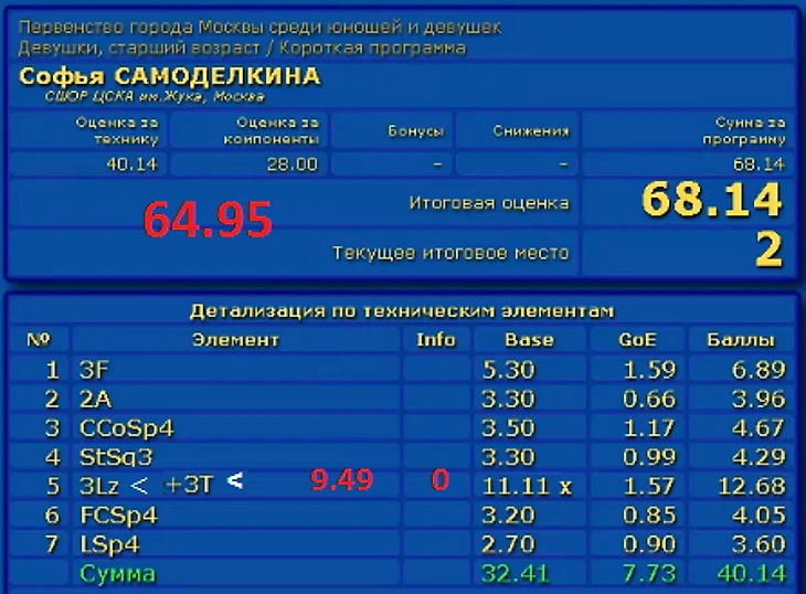 3Lz< +3T< Учитывая качество исполнение остальных в первой шестёрке, такой каскад должен был быть наказан. Лутц предусматривает одновременный отрыв лезвий после удара зубцом. Софьюшка проехала весь первый оборот на льду - ГОЕ 1.57.