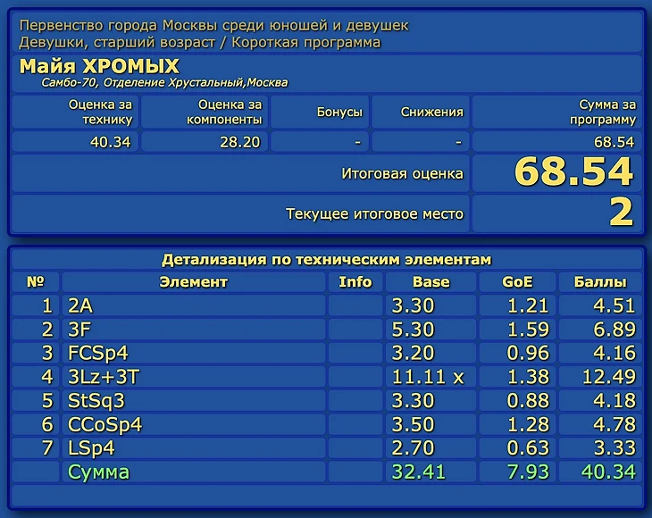2А - это лучше чем у Косторной. Полное отсутствие видимого усилия при отрыве и приземлении. Исполнение в центре арены позволяет увидеть реальную длину полёта. ГОЕ 0.88, на самом деле 4 уровень 1.32. Соне не выходит на этапы ЮГП в следующем сезоне... она потерпит. Компоненты не ставили вообще... от слова совсем.