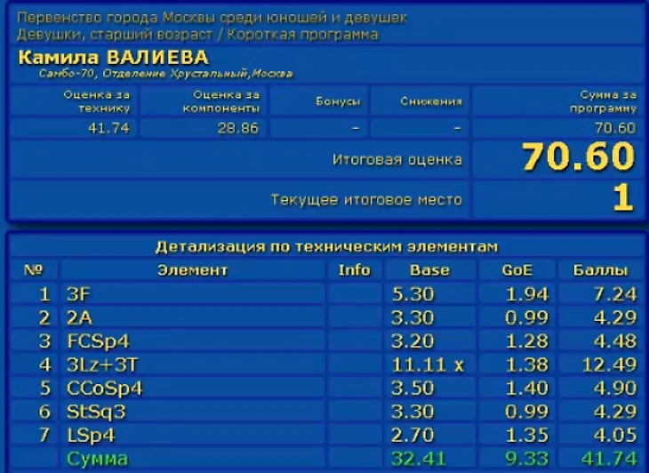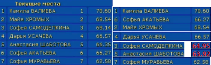 За 2А Валиева получила 0.99. Видите разницу между использованием векторов силы на скорости Акатьевой и толчковое усилие Валиевой?
