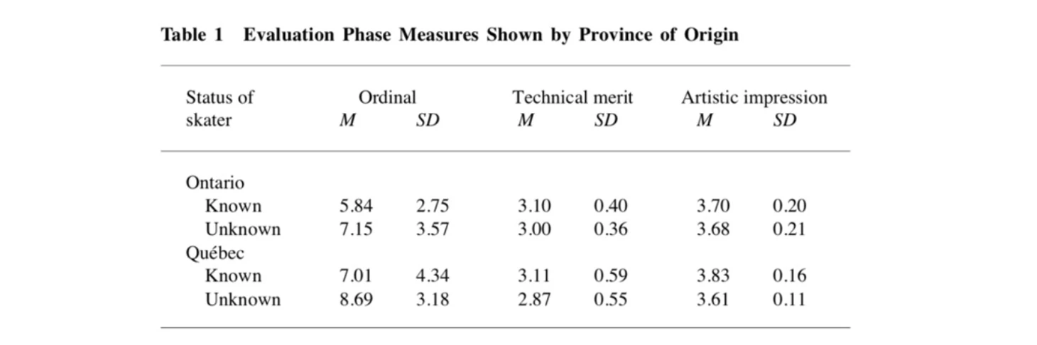 Оценивание катания фигуристов, особенно выставление оценок за технику в режиме реального времени – очень сложная задача. Судьи, как и все люди, способны ошибаться или просто уставать. Есть и другие факторы, влияющие на выставление оценок членами жюри. Так, было, например, доказано, что спортсмены, которые выступают в конце соревновательного дня получают за тот же уровень катания более высокие оценки, чем те, кто выступает в начале. Однако в данной статье мне бы хотелось рассказать в том, как громкое имя спортсмена в фигурном катании может влиять на оценки судей на примере исследования Лианны С. Финдли и Дайаны М. Сте-Мари «Смещение оценивания в зависимости от репутации в фигурном катании»(Leanne C. Findlay and Diane M. Ste-Marie “A Reputation Bias in Figure Skating Judging”), опубликованного в 2004 году. В ходе исследования было выяснено, что фигуристы, с достижениями которых знакомы судьи, завоевывают более высокие места и получают более высокие оценки за технику, чем те, чьи имена судьи слышат впервые. На оценки за артистизм, как ни странно, данная закономерность не распространяется. Эксперимент проводился в Канаде. Для него были собраны видеозаписи местных соревнований разных школ фигурного катания: в Восточном Онтарио и в Квебеке. Судьи, принявшие участие в исследовании, работали в тех же секциях.