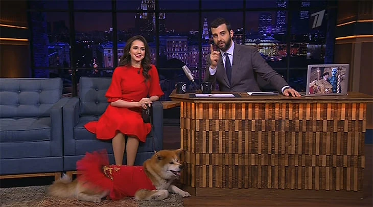 Алина Загитова – самая титулованная фигуристка современности – впервые появилась в эфире «Вечернего Урганта». И не одна, а с собакой Масару, одетой в красную пачку.