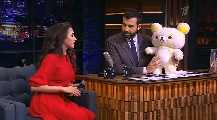 Загитова подарила Урганту плюшевую салфетницу, которая всегда с ней в кисс-энд-край (только в меньшем размере):