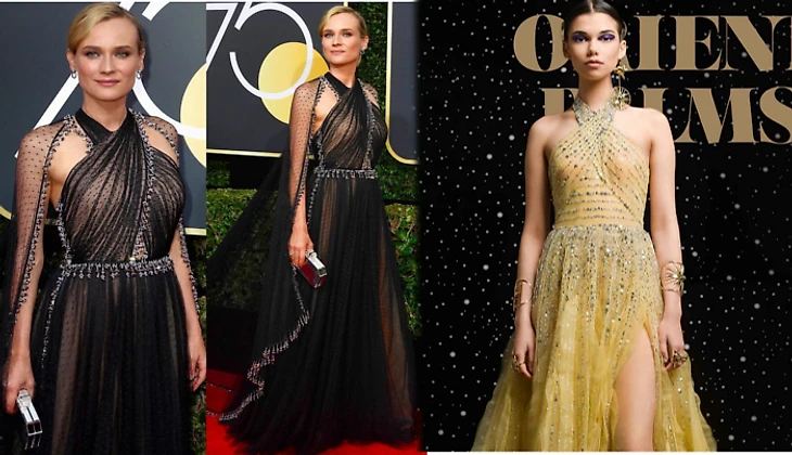 У Алексы нежное, романтическое платье, с кокетливо спадающей бретелькой со все еще модной разноуровневой длиной юбки. Цветовое сочетание ей очень к лицу, модные дома тоже одобряют…Так что кажется, придет закрыть глаза на пресловутый градиентик, ужасный и великий)