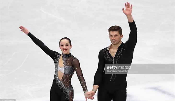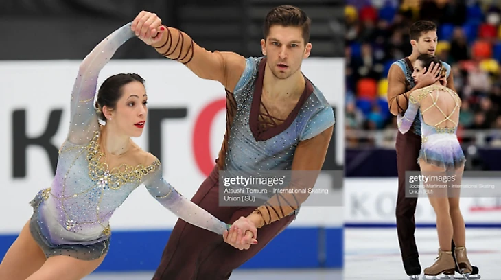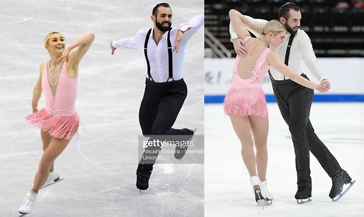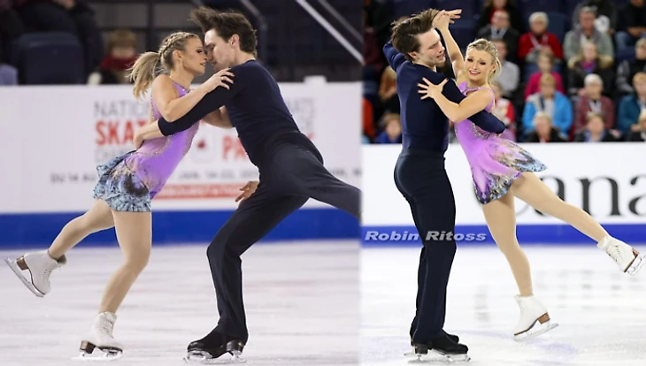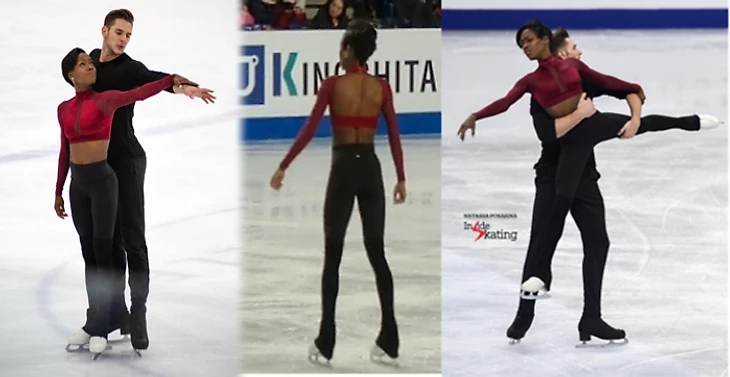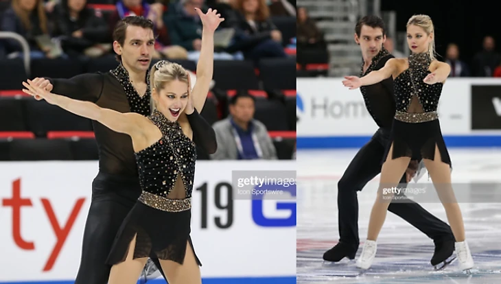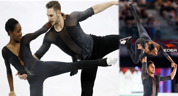 Еще одни дебютанты модного рейтинга. Канадское парное старается держать марку. Наверное, это единственный «брючный костюм» в сезоне, который мне понравился без всяких но. Учитывая особенности фигур фигуристок они идут далеко не всем и нужно быть очень аккуратным с пропорциями. У Эвелин прекрасная фигура – есть талия, ноги длинные (плохо для элементов, но главное чтобы костюмчик сидел). И мне нравится идея отойти от привычного варианта комбинезон. Брюки + топ выглядит свежее и интереснее. Не смотря на открытость топа, вульгарно это не смотрится. Декольте Трента, конечно, могло быть не столь внушительно) Хотя, дамам, наверное, понравилось. Костюмы выполнены в одной стилистике, на партнера не забили выдав ему просто брюки и просто рубашку.