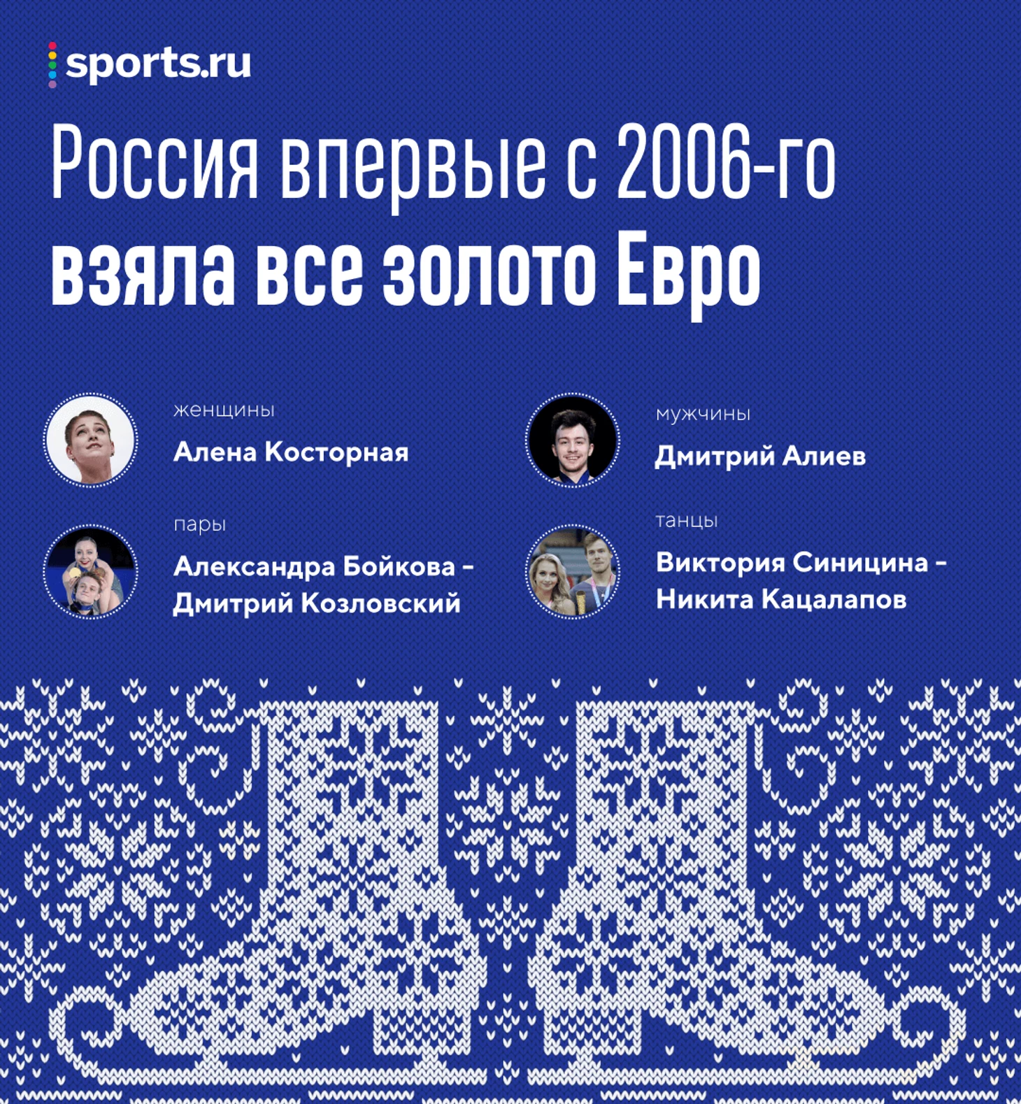 • в женском катании, наоборот, все забетонировано: последний раз Россия упускала золото Евро в 2013-м. За это время только Евгения Медведева делала дубль, а теперь титул переходит от Софьи Самодуровой к Алене Косторной.