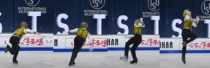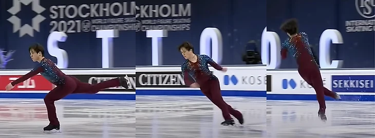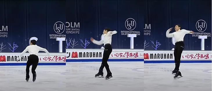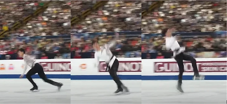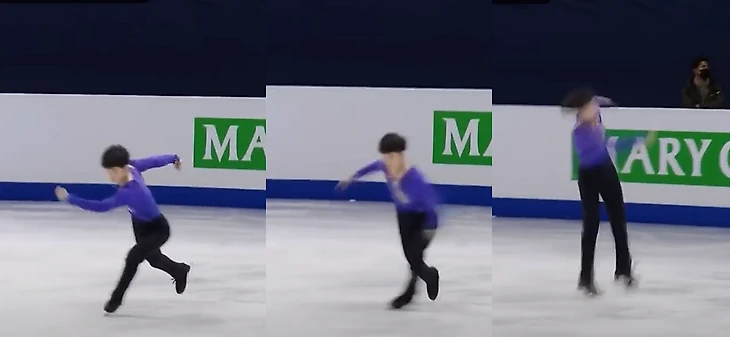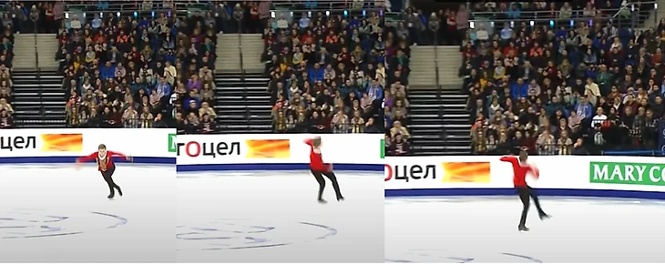 К эталону приведем флип в четыре оборота Натана Чена, обладателя одних из самых качественных прыжков. Первый кадр - момент отталкивая, второй - момент отрыва одной ноги, третий - момент полного отрыва. В момент полного отрыва Чен на льду не сделал даже четверть оборота, большая часть прыжка докручена в воздухе. Сравним, так ли дела у остальных спортсменов.