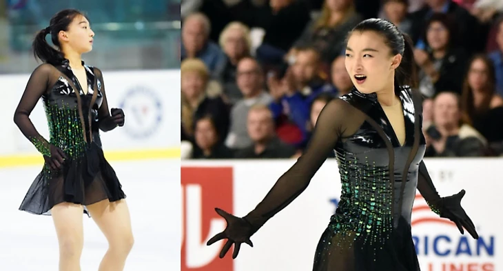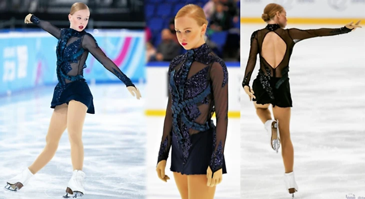 Темно-синее, обильно посыпанное стразами, как пончик глазурью, это настоящая хитярушка фигурной моды. Проверенная годами и фигуристками разных фигур, фактур и комплекций. Подходит и для романтИка, и для классики. Необходимейшая в хозяйстве вещь. Все очень красиво…Но почему позеленела сетка? От зависти к самой себе? Пролила абсент? Клята экология? А может добрая Ю помогала Александре Фейгин оттирать зеленку с рук?