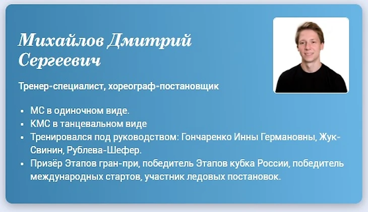 Теперь там числятся Евгений Плющенко, Елена Ильиных и Дмитрий Михайлов. И если первые две фамилии хорошо знакомы всем любителям фигурного катания, то последний может быть известен лишь выступлением с Евой Куць за юниорскую сборную России в танцах на льду.