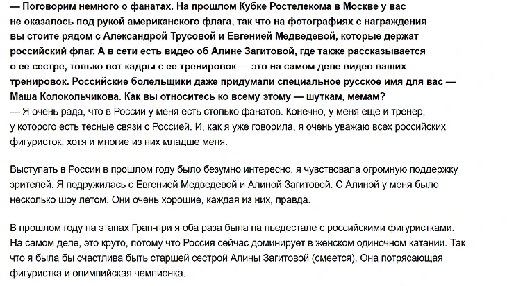 Американская фигуристка Мэрайя Белл в своем интервью для SPORT24 рассказала немного об Алине