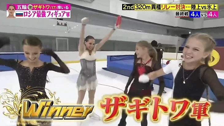 Загитова ранее уже бывала в роли капитана. На шоу в Японии в апреле 2019 года на местном телеканале TBS TV вместе с Трусовой, Щербаковой и Косторной она выступила в нескольких околоспортивных конкурсах. Наиболее похожим на спорт был конкурс на эстафетное преодоление дистанции. Девочки соревновались с четырьмя японцами, в составе которых был один профессиональный бегун и три актёра. Один из них был с лишним весом, видимо, чтобы уравнять шансы девочек (но бегал достаточно быстро). Каждому из них нужно было добежать до точки и обратно. Кто быстрее, тот и победил. Японцы бегали по обычной дорожке, а девочкам предстояло преодолевать расстояние на льду.