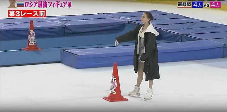 Счёт был 1:1 и дело шло к ничьей. Но Алина была бы не Алиной, если бы не целилась на победу. Камеры выхватили её разговор с Трусовой, где она обратила внимание на несправедливые правила, обязывающие фигуристов половину пути катать задним ходом, в то время как от японцев подобного не требовали. После поражения во втором раунде Косторная начала возмущаться, а Трусова обсуждала с Алиной технику бега. Заметив это, организаторы вывели их разговоры в свет и приняли решение сократить отрезок, в котором фигуристы должны повернуться спиной вперёд перед поворотом. После корректировки правил фигуристки приняли участие в забеге вчетвером. Загитова объяснила девочкам технику для более эффективного преодоления дистанции. Третий раунд и итоговая победа были за фигуристками.