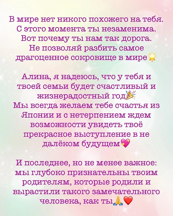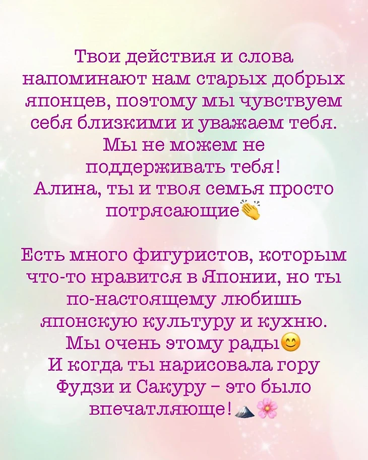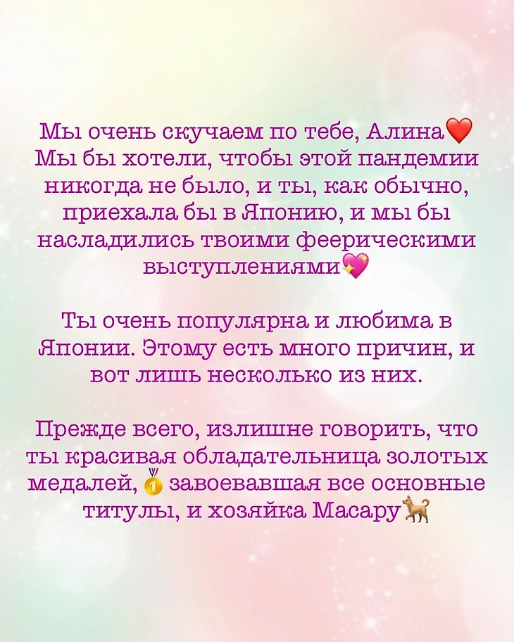 А это поздравление известной японской болельщицы @yura_tamaura, в котором она исчерпывающе рассказывает, почему Япония любит Алину, я хочу вынести в этот пост в виде фото, которые она поместила в карусель, настолько оно потрясающее и крутое. Спасибо вам, японские болельщики, спасибо, Япония! Вы невероятные!