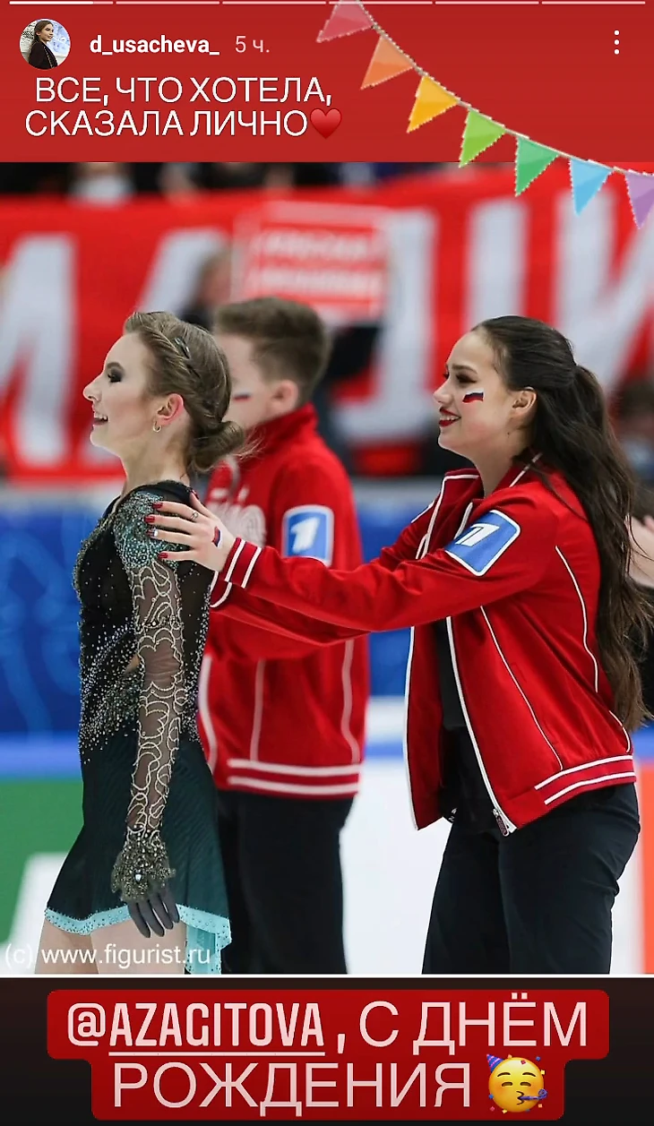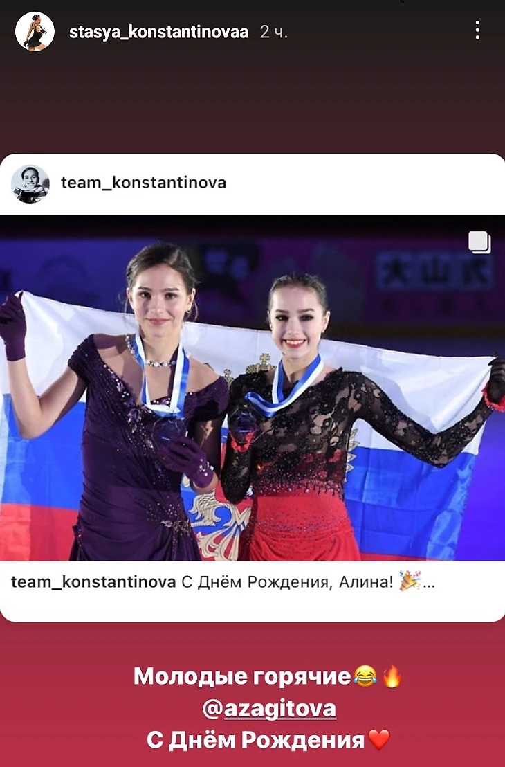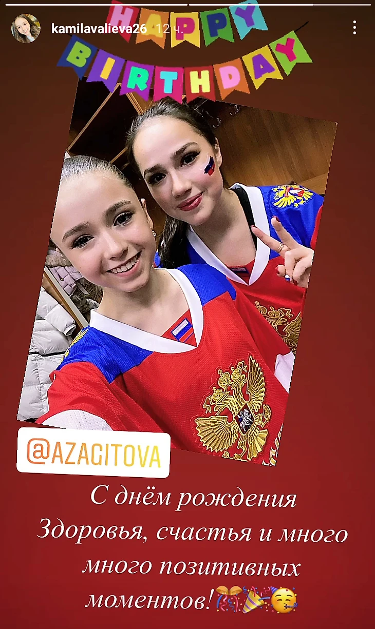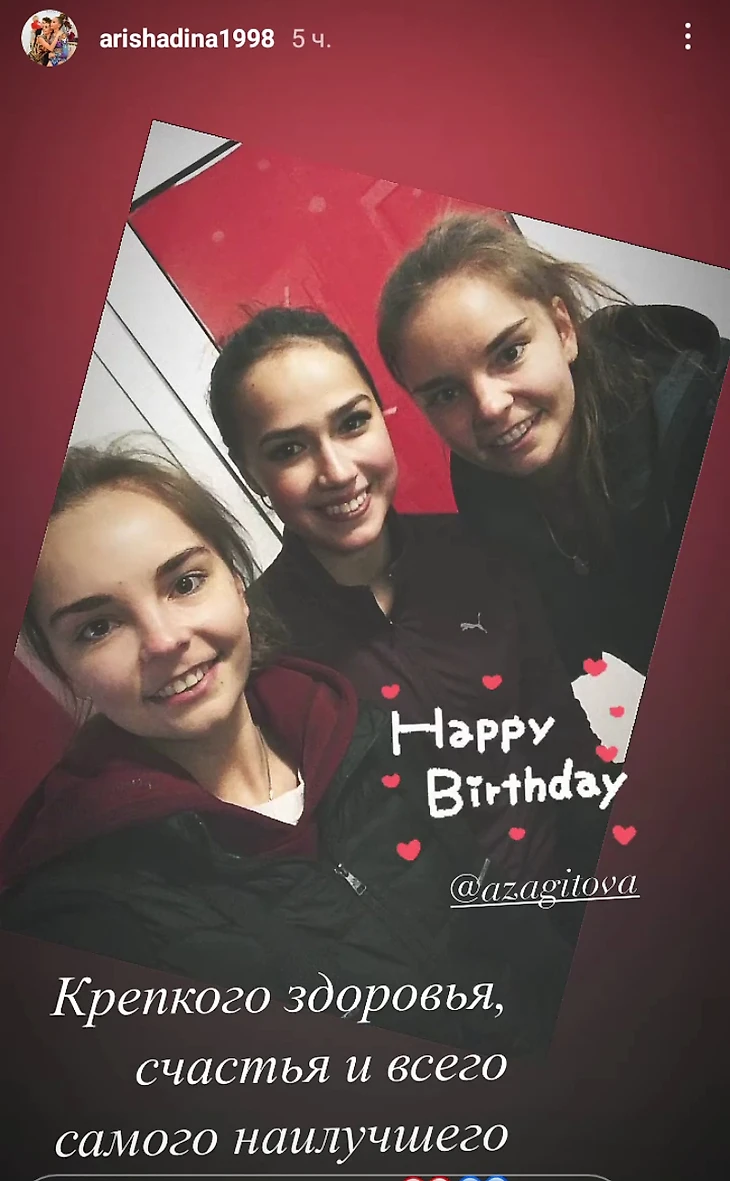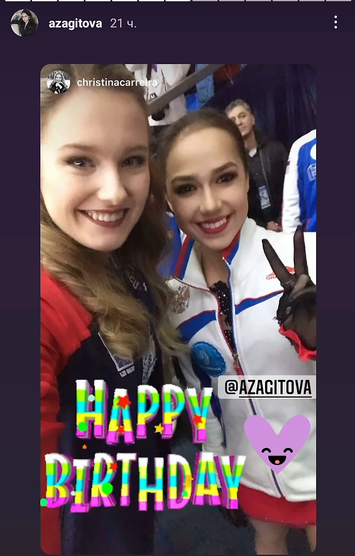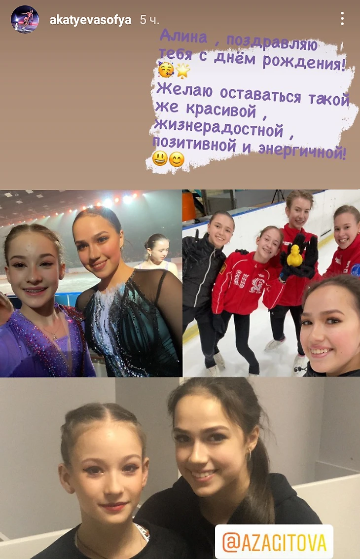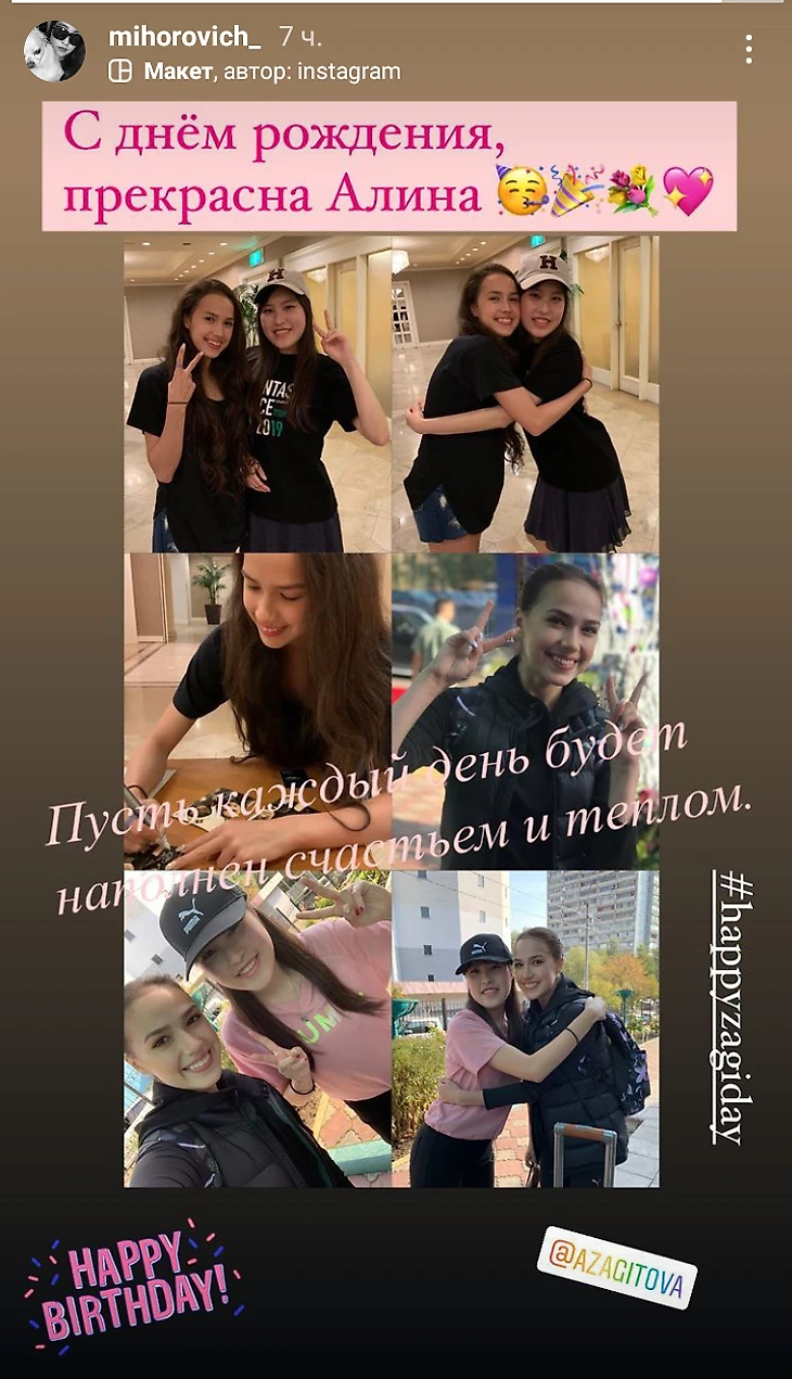 Фан-аккаунт Марин Хонда: "Алина С ДНЕМ РОЖДЕНИЯ !!!! Поздравляем Загги! Закитовой, которой было 15 лет во время Пхенчхана, 19 лет Σ (˙꒳ ˙)!? Я не могу поверить в это, лол Пожалуйста, продолжайте усердно работать над фигурным катанием!"