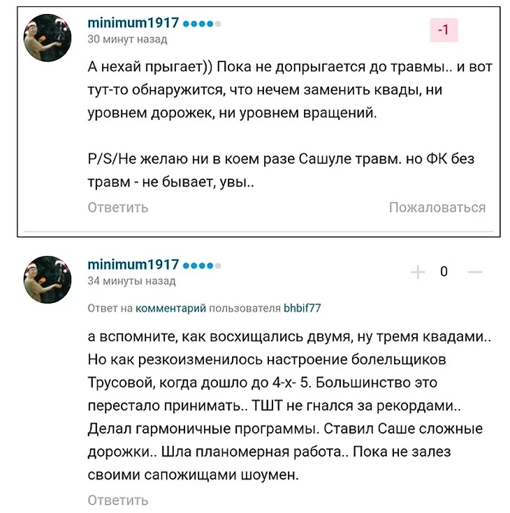 Песня «У Трусовой нет ничего, кроме прыжков» зачастую этими словами и ограничивается, без каких бы то ни было пояснений или доказательств, и, что самое печальное, хорошо плюсуется. Когда в комментариях пишут, что не видят прогресс Саши, то понятно, что большинство из них просто не хотят этого видеть. Человек, ушедший от ТШТ, не должен прогрессировать ни в чём! Выиграет Саша медаль на ЧМ - это будет хрустальный багаж, а не выиграет - багаж закончился, Плющ виноват и т.п.