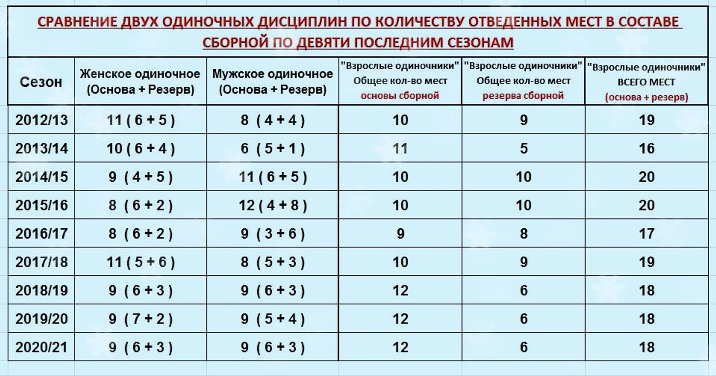 Да, безусловно определенная корреляция между распределением и соотношением мест в составе сборной между мужским и женским одиночными видами присутствует. Но она особенно четко заметна, именно за три последних года формирования сборной на новый сезон. Посмотрите последний столбец - строго и четко выполняются лимиты на количество мест, только с 2018-го. До этого - бывало всякое.