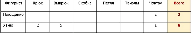 Для того, чтобы понять, что именно 4.50 - справедливая оценка Плющенко за те же переходы, можно сравнить, например, сложность его программы и Юдзуру Ханю. В таблице ниже Морфеус посчитал все сложные шаги за прокат.