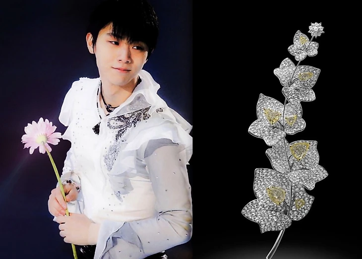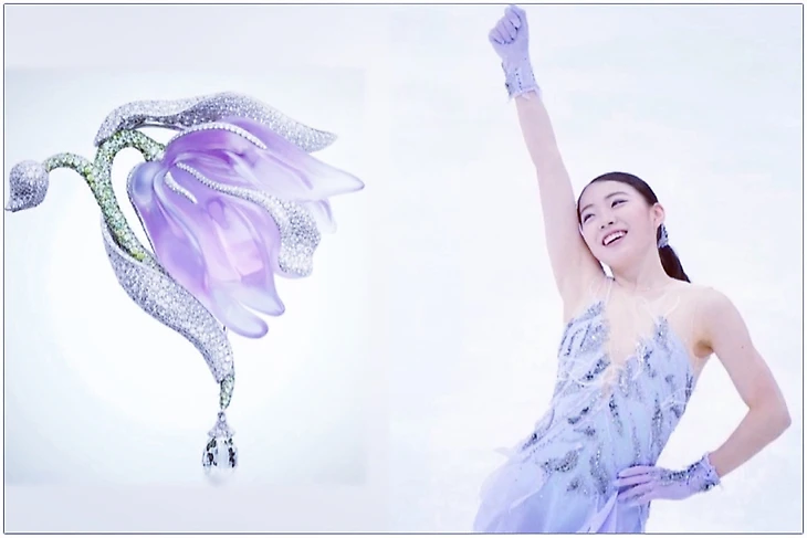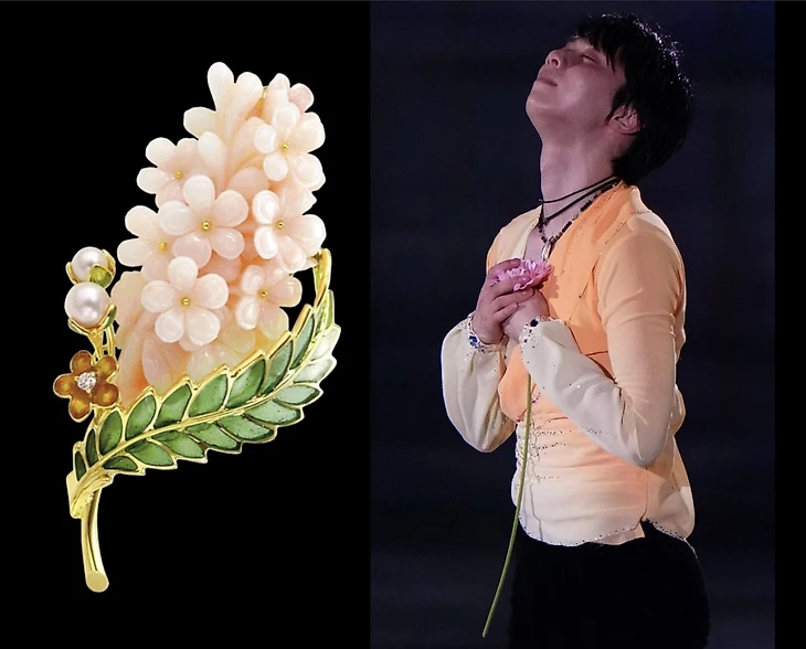Коралл розового цвета называют кожей ангела. Коралл бывает всех оттенков розового, от очень бледного, почти белого до темно-лососевого. Kawamura, японский ювелирный дом, работает с кораллами, добытыми из этичных источников. Брошь изготовлена из резного уголка кожи коралла в виде цветов. Он дополнительно украшен жемчугом и драгоценными камнями