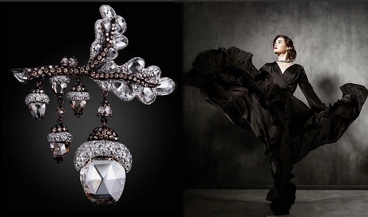Брошь «Птица» от Prima Gems. Она инкрустирована жемчугом и бриллиантами.