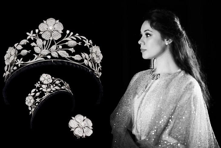 Тиара (от латинского: тиара, от древнегреческого: τιάρα) - это украшенная драгоценностями декоративная корона, которую традиционно носили женщины. Ее надевают во время официальных мероприятий. Платиновая цветочная тиара изготовленная лондонской ювелирной фирмой E. Wolfe Co. Тиара состоит из нежных цветочных и лиственных брызг, в центре которых находится большая полностью открытая пятилепестковая дикая роза, украшенная тремблантом с двумя дополнительными соответствующими розовыми мотивами. Тиара была разработана для преобразования в ожерелье, а розы в брошь и пару серег.