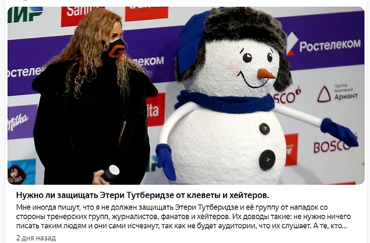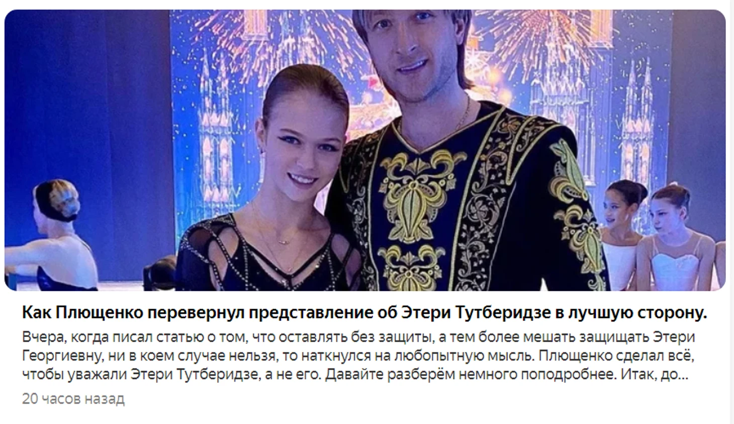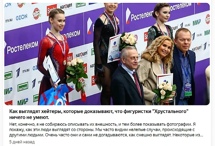В реальном же мире я наблюдаю обратное: беспрестанные славословия на главном рупоре страны, «Первом ТВ-канале», Тутберидзе, Загитовой, Глейхенгаузу, Валиевой и так далее. До бесконечности, сердечно им рады Ургандт и все дикторы новостей, «С добрым утром страна», Гордон и прочие прославленные телеведущие.
