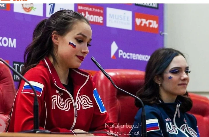 Когда проходило шоу на кубок Первого канала, спортсменов условно разделили на команды, и в шутку назначили им капитанов, Медведеву, и Загитову. У Жени была оригинальная, адекватная событию подводка, что-то на космическую тему. Загитова же зачем-то вымазалась в патриотический триколор, типа ее команда российская, а у соперников нет?