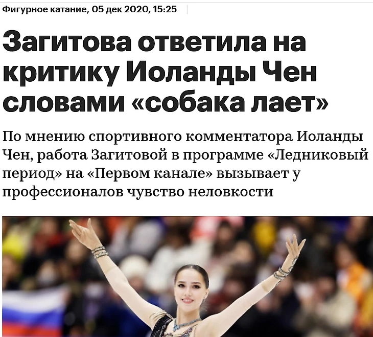 Неужели малолетка Загитова Алина, благодарившая Всевышнего за свою золотую олимпийскую медаль, назвала женщину намного старше себя, собакой? Или как это понимать? Может быть фанаты Загитовой объяснят правильный смысл этой выходки Алины?