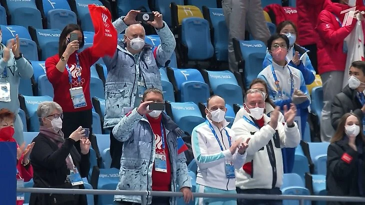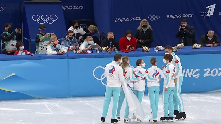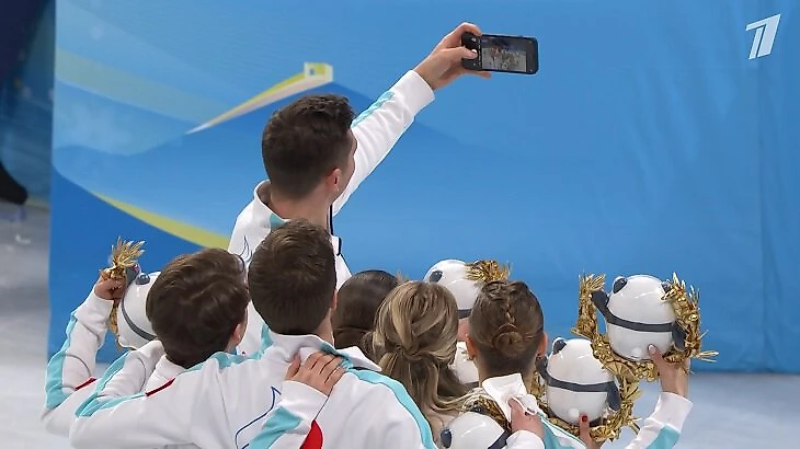 После женской произвольной программы, на которую Валиева выходила уже в статусе олимпийской чемпионки, провели церемонию награждения. Пока не медалями – их вручат вечером. Фигуристы получили талисман Пекина-2022 панду Бин Дунь Дунь. За награждением следил и глава Олимпийского комитета России Станислав Поздняков (он справа в нижнем ряду, в куртке с черной молнией).