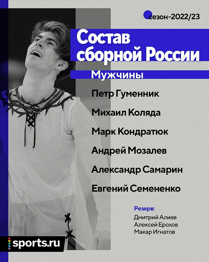 • Прошел по критериям и Александр Самарин, а вот вместо Макара Игнатова в сборную взяли Петра Гуменника. У Игнатова в активе – 4-е место на этапе Гран-при, у Гуменника 8-е. По критериям в сборную должен попадать Макар, но в федерации, видимо, решили, что в данном случае важнее чемпионат России – там Гуменник 5-й, а Игнатов только 10-й.