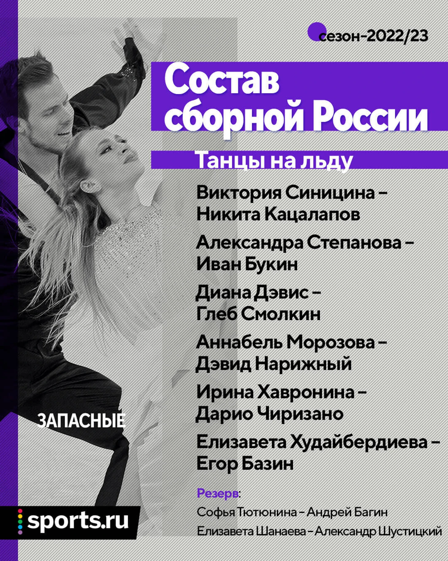 • А вот дальше интереснее. Четвертое и пятое места на ЧР заняли Аннабель Морозова и Андрей Багин, Елизавета Шанаева – Дэвид Нарижный. Они бы и попадали в состав виртуально, но дуэты распались. Морозова встала в пару с Нарижным, Багин – с Софьей Тютюниной, Шанаева, как сообщала федерация, приступила к тренировкам с Павлом Дроздом, но его в списках теперь вовсе не указано, зато указан Александр Шустицкий,