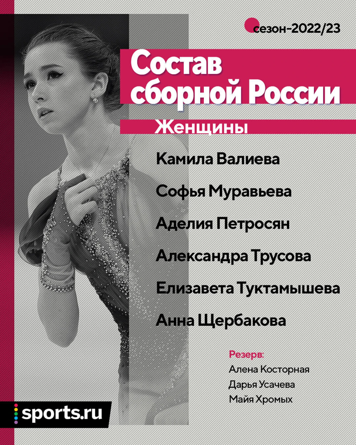 Вообще, основа выглядит так, будто выбирали приоритетно по результатам чемпионата России-2022: Валиева, Трусова и Щербакова тогда забрали медали, Петросян стала 4-й, Муравьева – 6-й, Туктамышева – 7-й.