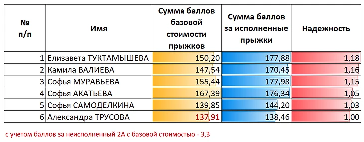 На основе данных по серии Гран-при России текущего сезона я составил рейтинг надежности. Показатель надежности рассчитывается как отношение суммы баллов базовой стоимости прыжков в исполненной программе к сумме баллов, фактически полученной за эти прыжки. Вот, что получилось:
