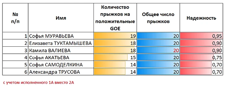 В первой публикации показатель надежности выводился из отношения количества приземленных прыжков на положительные бонусные баллы за качество исполнения (положительные GOE) к общему числу прыжков. Рейтинг возглавила Анна Щербакова, ставшая Олимпийской чемпионкой в Пекине. Согласно этому рейтингу, надежность 6 лидирующих спортсменов серии Гран-при России текущего сезона выглядит следующим образом: