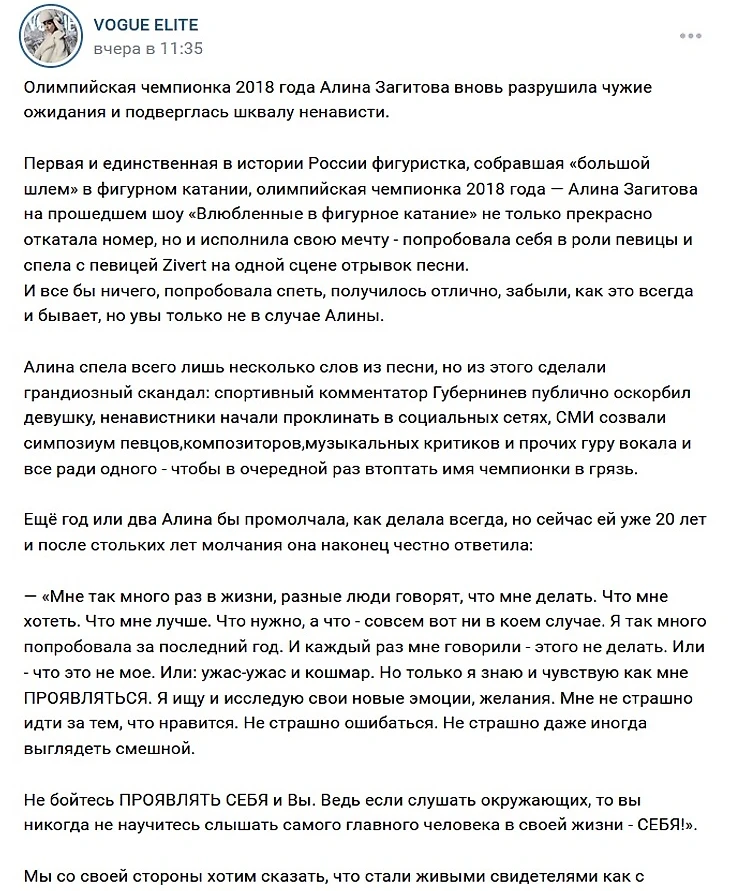 Интересное мнение VOGUE ELITE о дуэте ОЧ Алины Загитовой с Zivert и причинах травли со стороны позолоченных перьев РФ