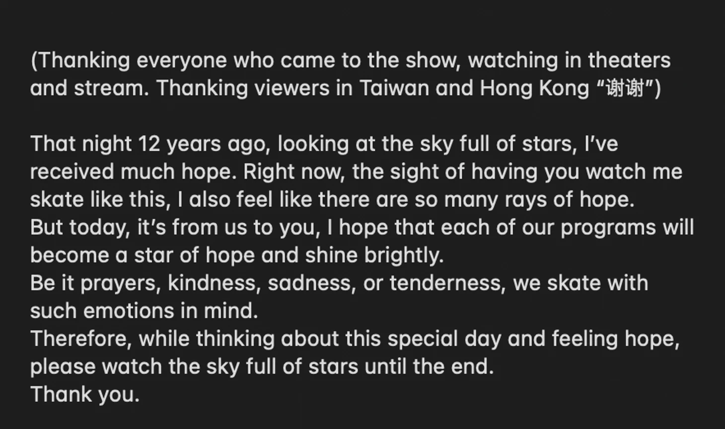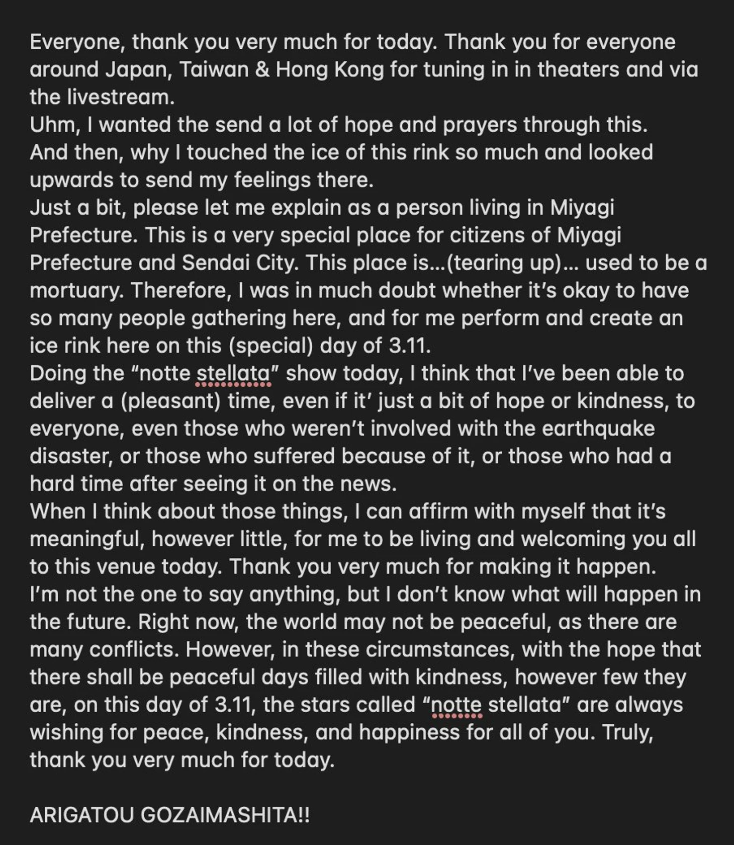 Перевод вступительной речи Юзуру на английский (источник: https://twitter.com/tsukihoshi14/status/1634455975317962753)