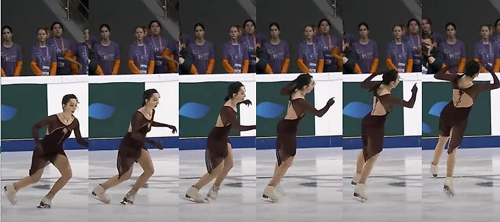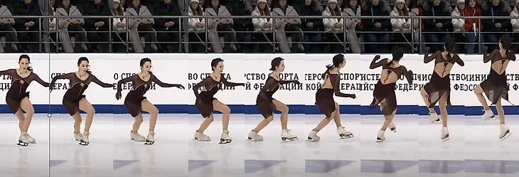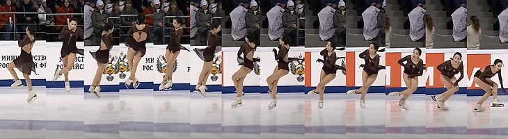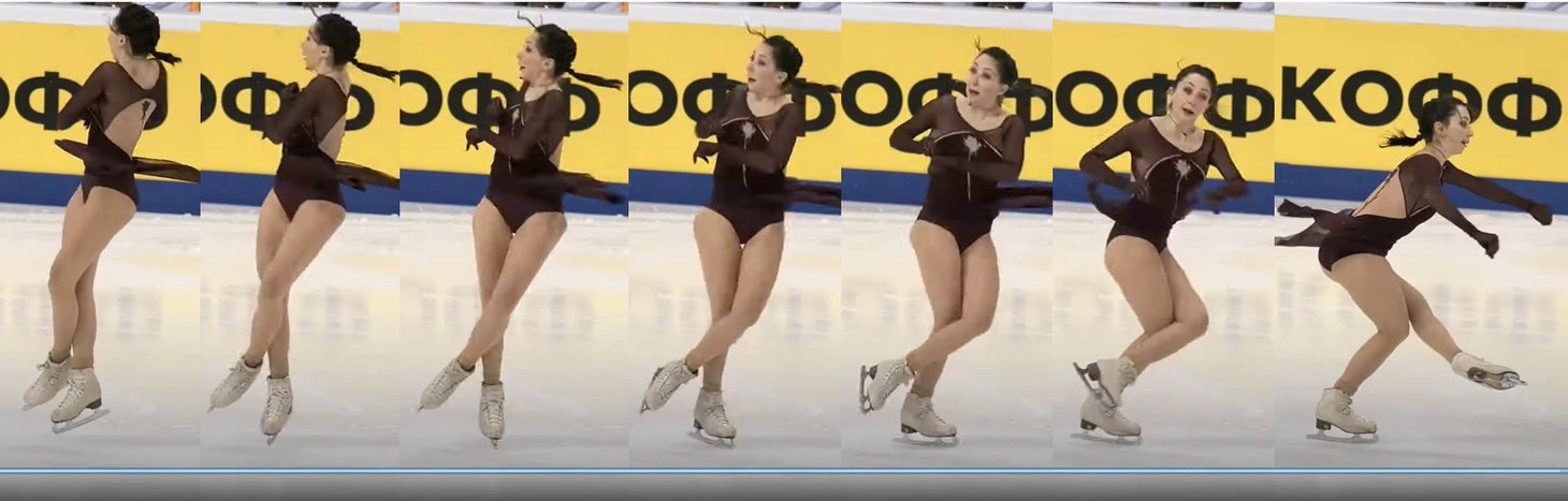 Что можно сказать о прыжковой технике. Ребра на старших зубцовых отличные. Но больше похвастаться нечем. Огромные преры на всех прыжках, кроме лутца и трикселя. Хотя и на трикселе прер не малый. На старших зубцовых реберное отталкивание. Слабо выглядят реберные прыжки, что на сальхове, что на риттбергере вместо трех оборотов в воздухе сделано два с четвертью.